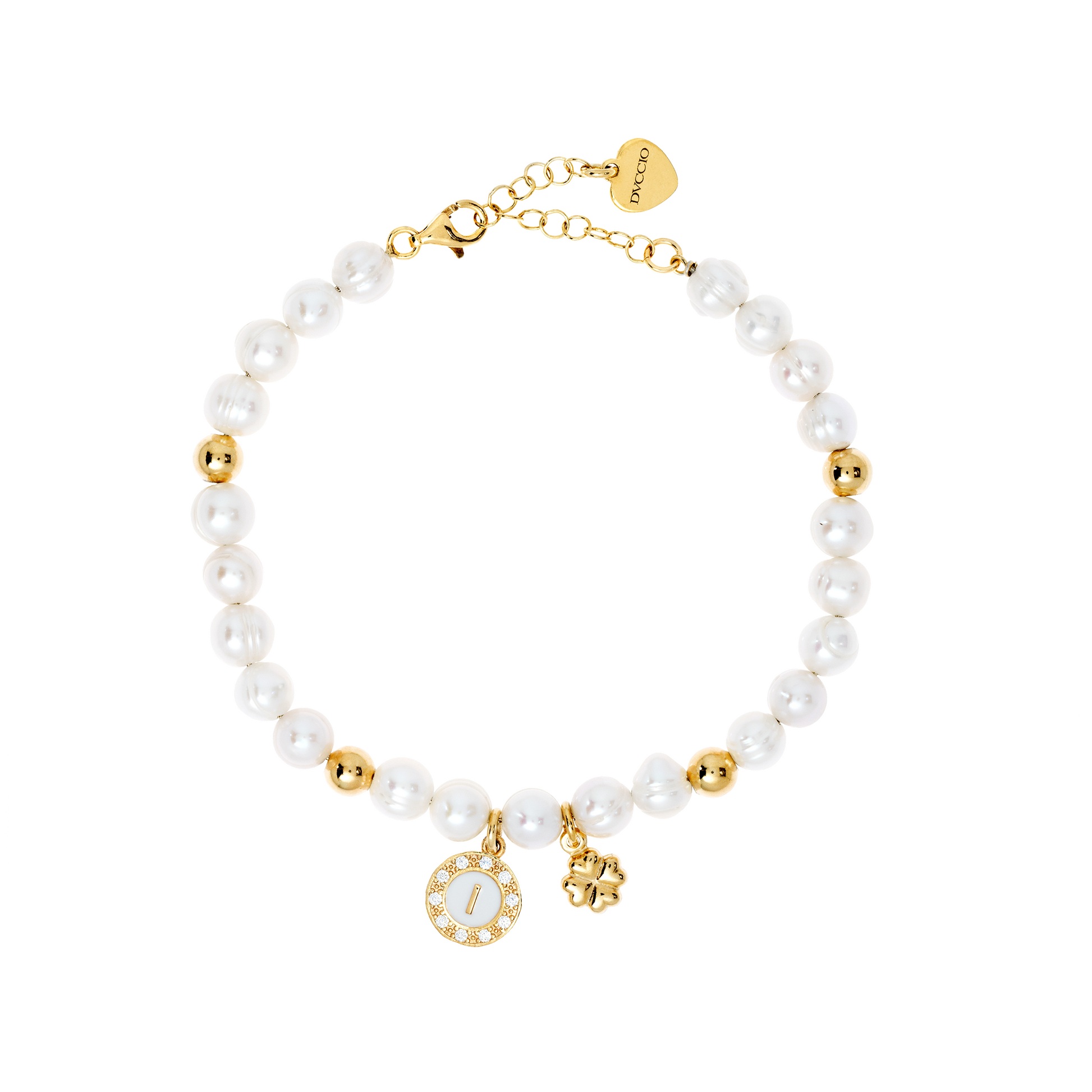 Bracciale Charlene in argento 925 con placcatura in oro giallo e perle di fiume naturali intervallate con sfere in argento dorato quadrifoglio e letterina pendente intercambiabile.