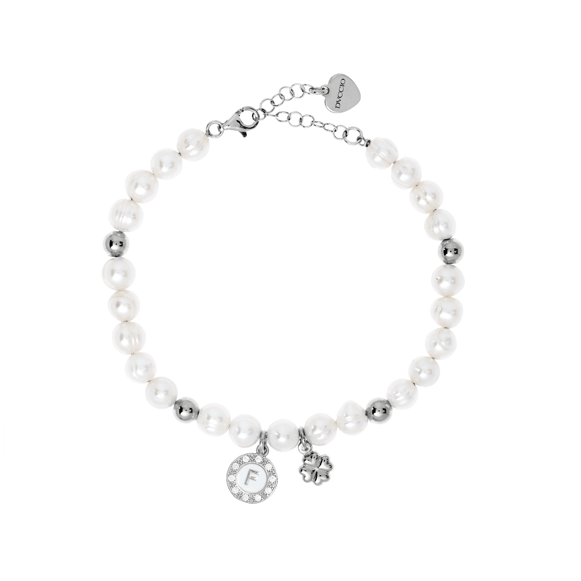 Bracciale Charlene in argento 925 con placcatura rodiato e perle di fiume naturali intervallate con sfere in argento dorato quadrifoglio e letterina pendente intercambiabile.