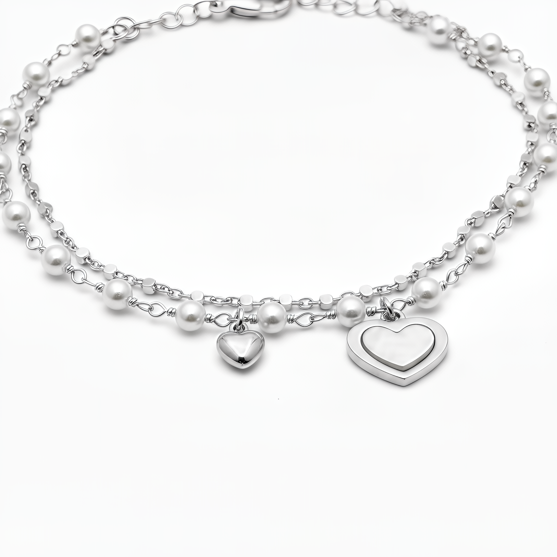 Le perle riflettono la luce con finezza, creando giochi luminosi che impreziosiscono ogni movimento del polso. Il design a doppio filo aggiunge profondità, armonia e un’eleganza moderna perfetta per donne che desiderano distinguersi con stile.