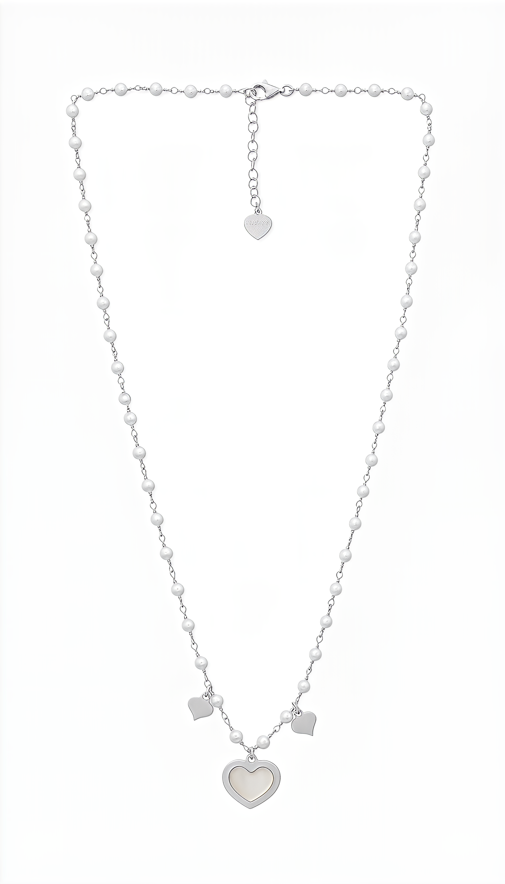 La Collana Cuore Divino DVCCIO celebra l’eleganza femminile con una raffinata catena di perle bianche e tre charms a forma di cuore, icona di purezza e sentimento. Il cuore centrale, impreziosito da madreperla naturale, cattura la luce e regala riflessi setosi e delicati.