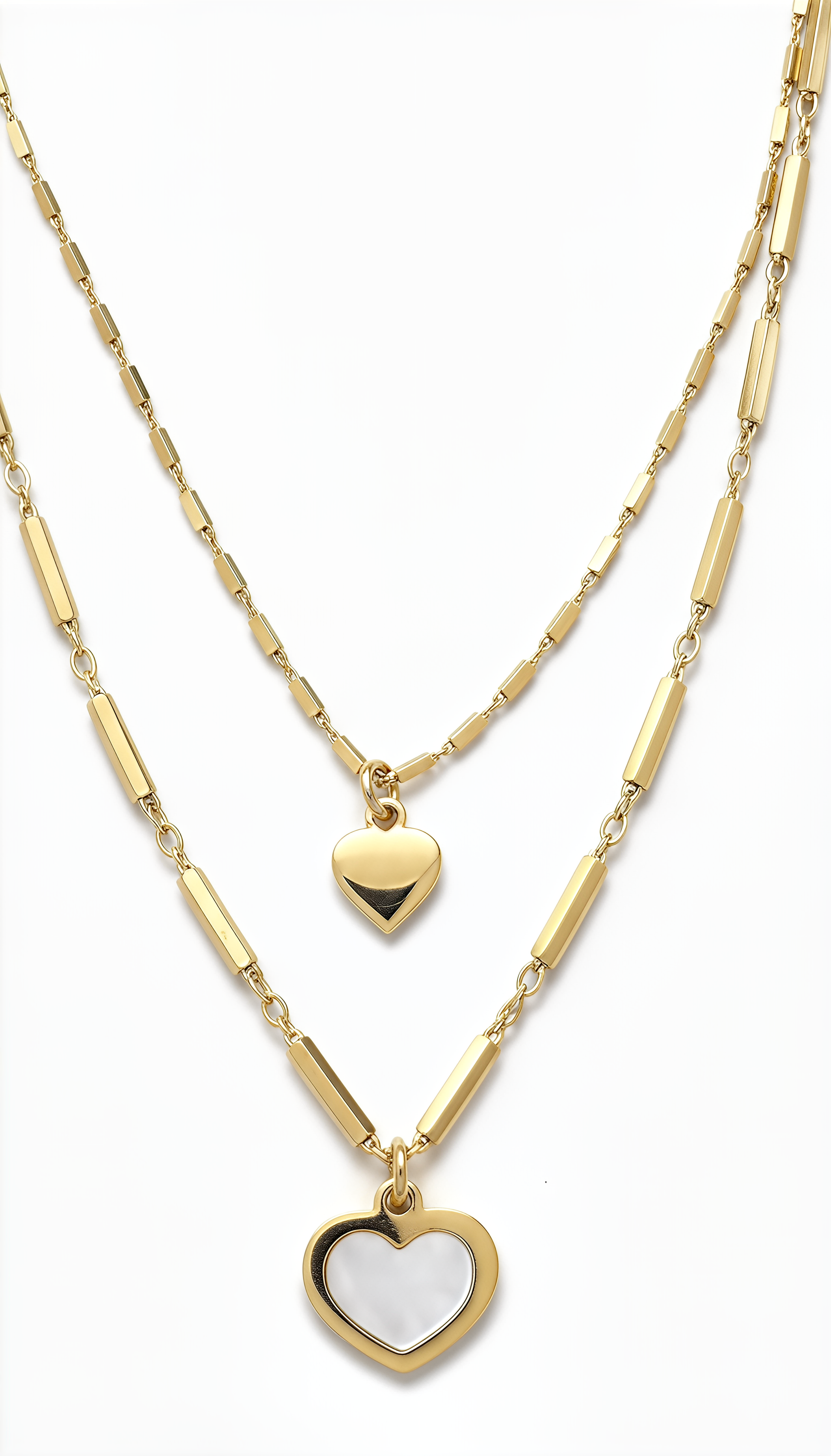 La Collana Cuore Luminosa DVCCIO è un gioiello iconico e moderno, pensato per chi desidera distinguersi con classe. La struttura a due fili alterna maglie geometriche dallo stile contemporaneo a due ciondoli a cuore: uno minimal sul filo superiore e uno più grande sul filo inferiore, impreziosito da un inserto in madreperla che illumina delicatamente il décolleté.