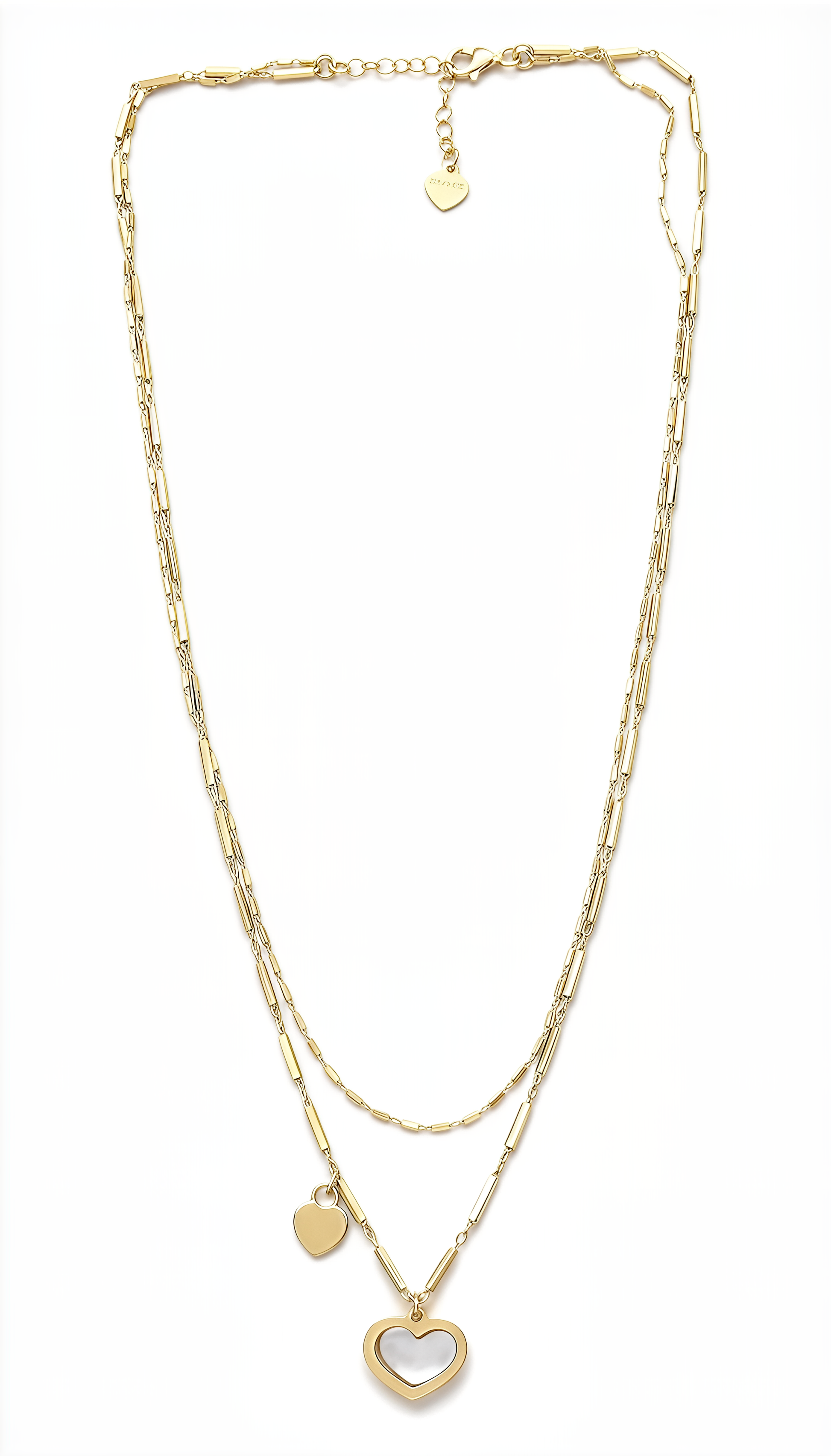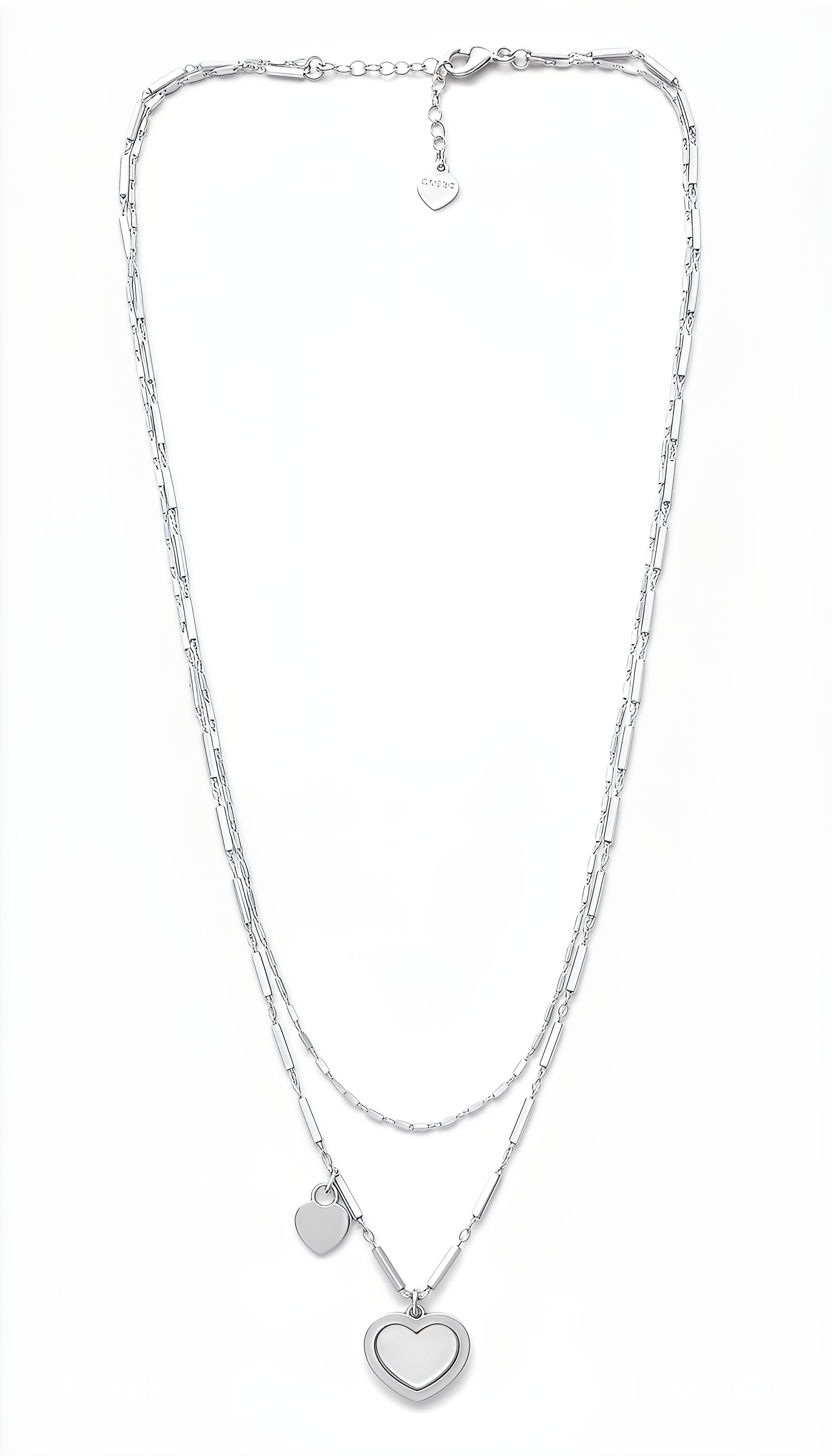 Una creazione elegante e raffinata firmata DVCCIO, caratterizzata dalla doppia catena lunga e dai due pendenti a cuore: uno pieno e uno vuoto. Un design contemporaneo che esprime femminilità, equilibrio e stile in ogni dettaglio.