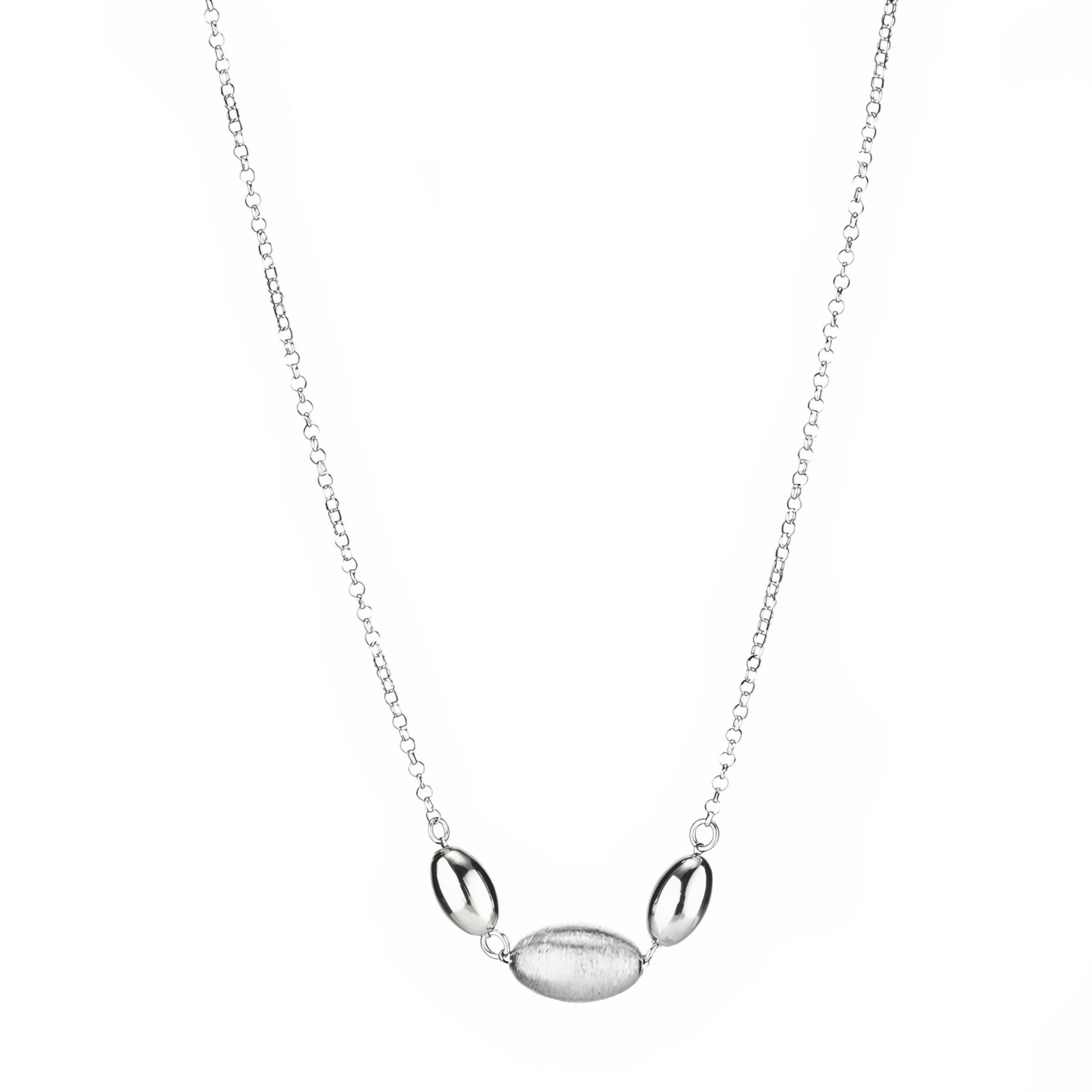 Le tre ovaline alternate satinate e lucide creano un raffinato gioco di riflessi, capace di donare luminosità e movimento al décolleté. Con una lunghezza di 42 cm più un’estensione di 3 cm, questa collana si adatta perfettamente sia ai look di tutti i giorni che agli outfit più eleganti.