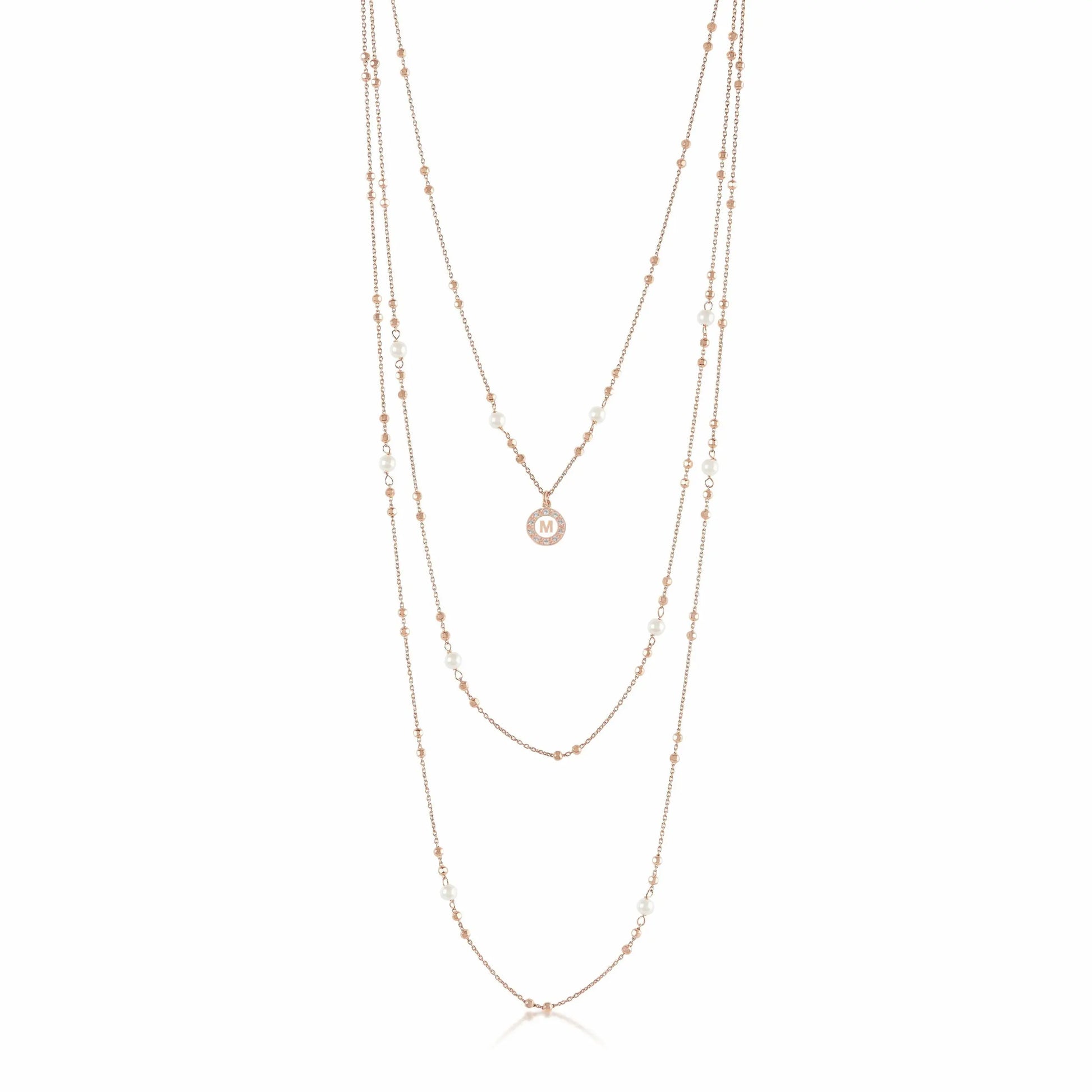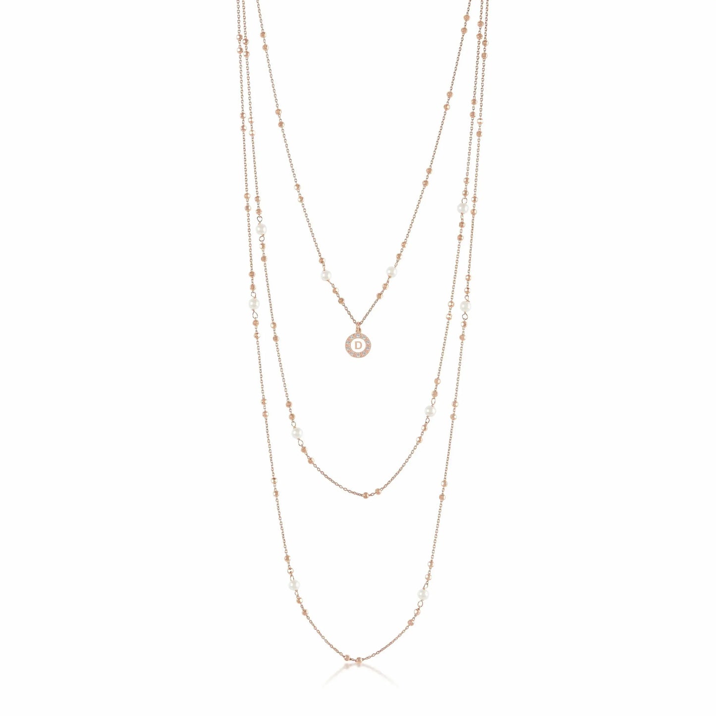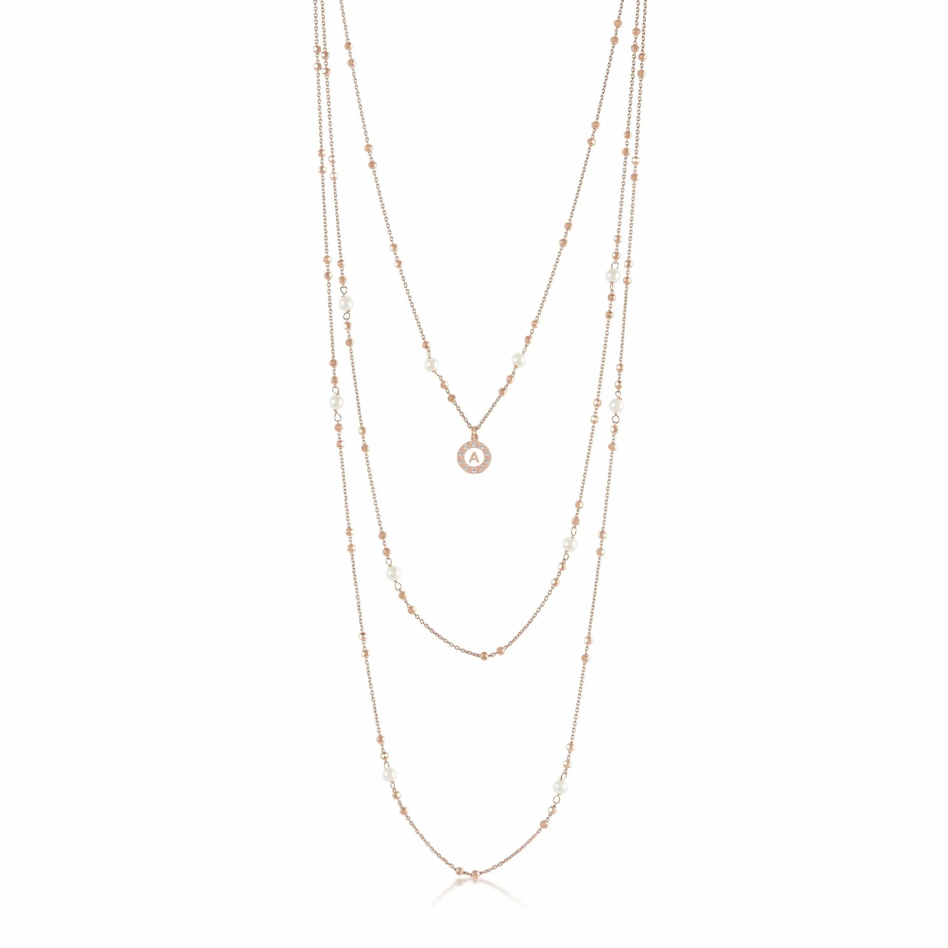 Questo elegante collana a tre fili, completamente regolabile, è realizzata in pregiato argento rosa e arricchita con perle bianche. L'iniziale in smalto bianco aggiunge un tocco personale e sofisticato alla tua collezione di gioielli. Perfetta per ogni occasione, è un must-have per chi ama lo stile classico e chic.