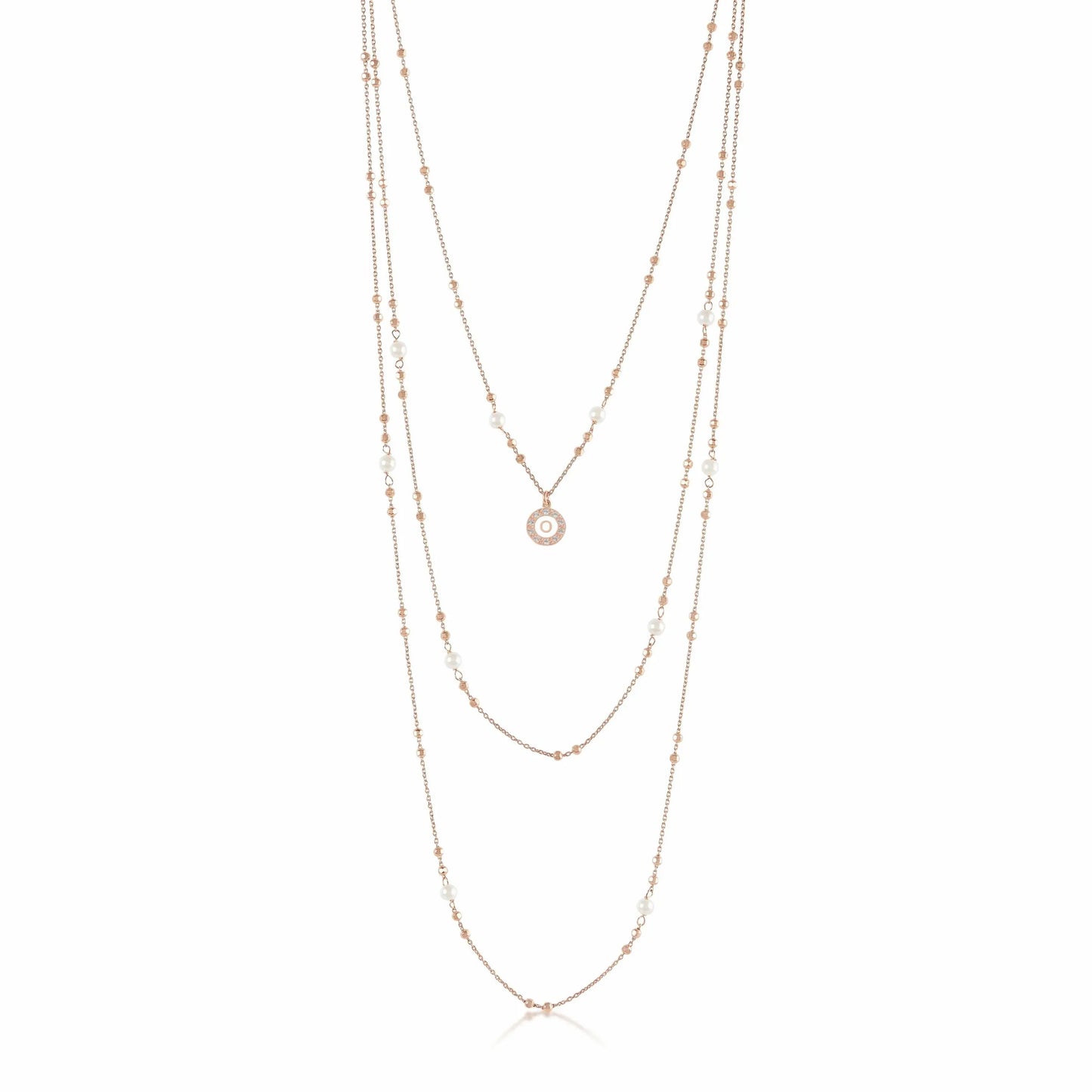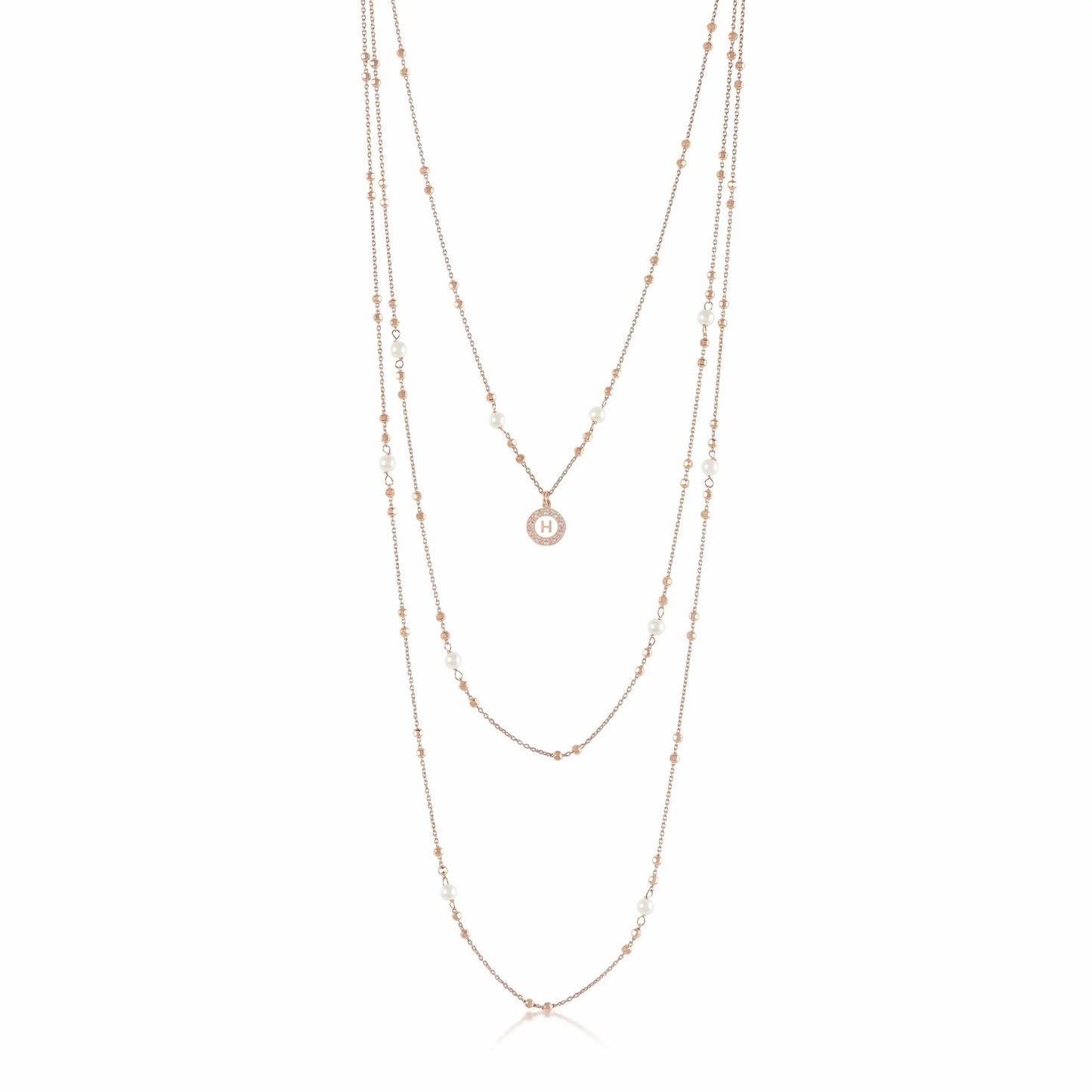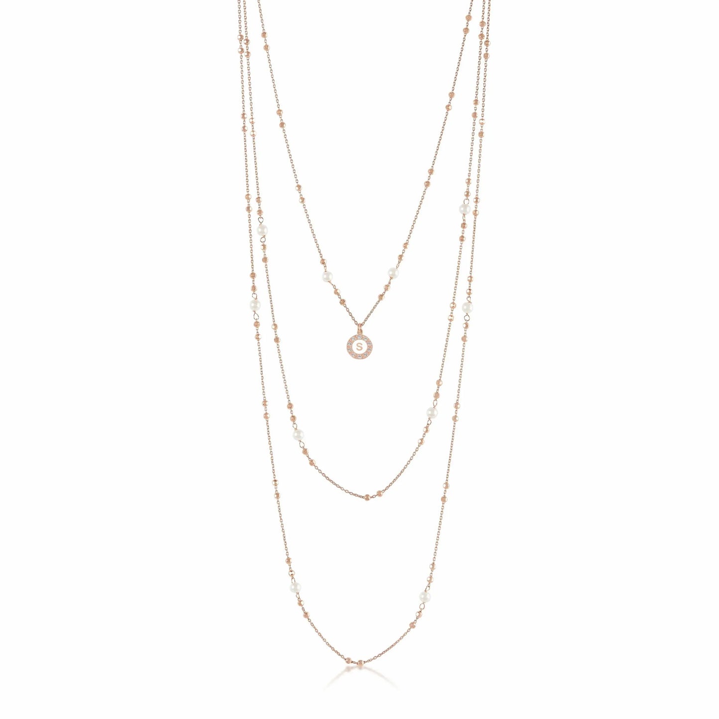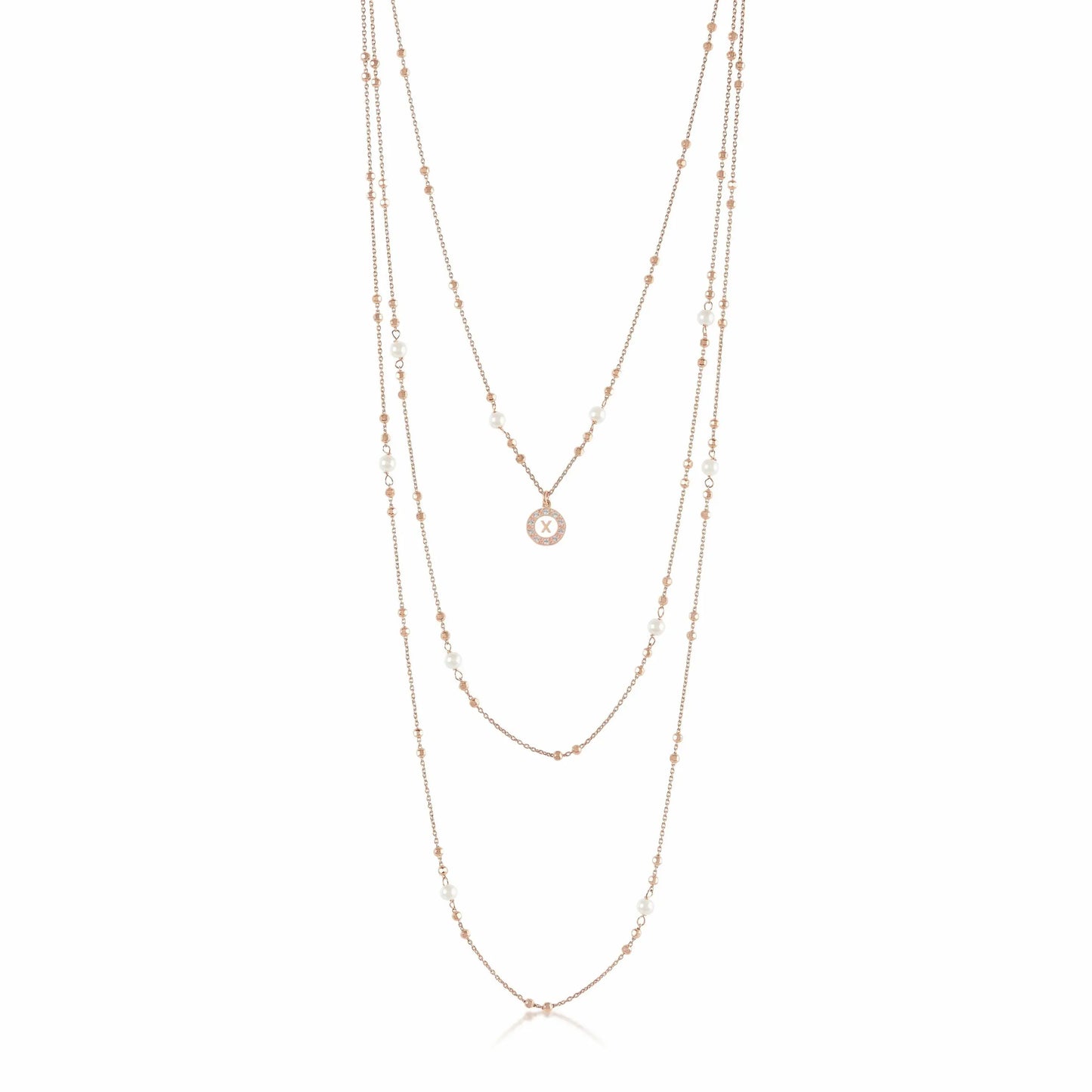 Questo elegante collana a tre fili, completamente regolabile, è realizzata in pregiato argento rosa e arricchita con perle bianche. L'iniziale in smalto bianco aggiunge un tocco personale e sofisticato alla tua collezione di gioielli. Perfetta per ogni occasione, è un must-have per chi ama lo stile classico e chic.