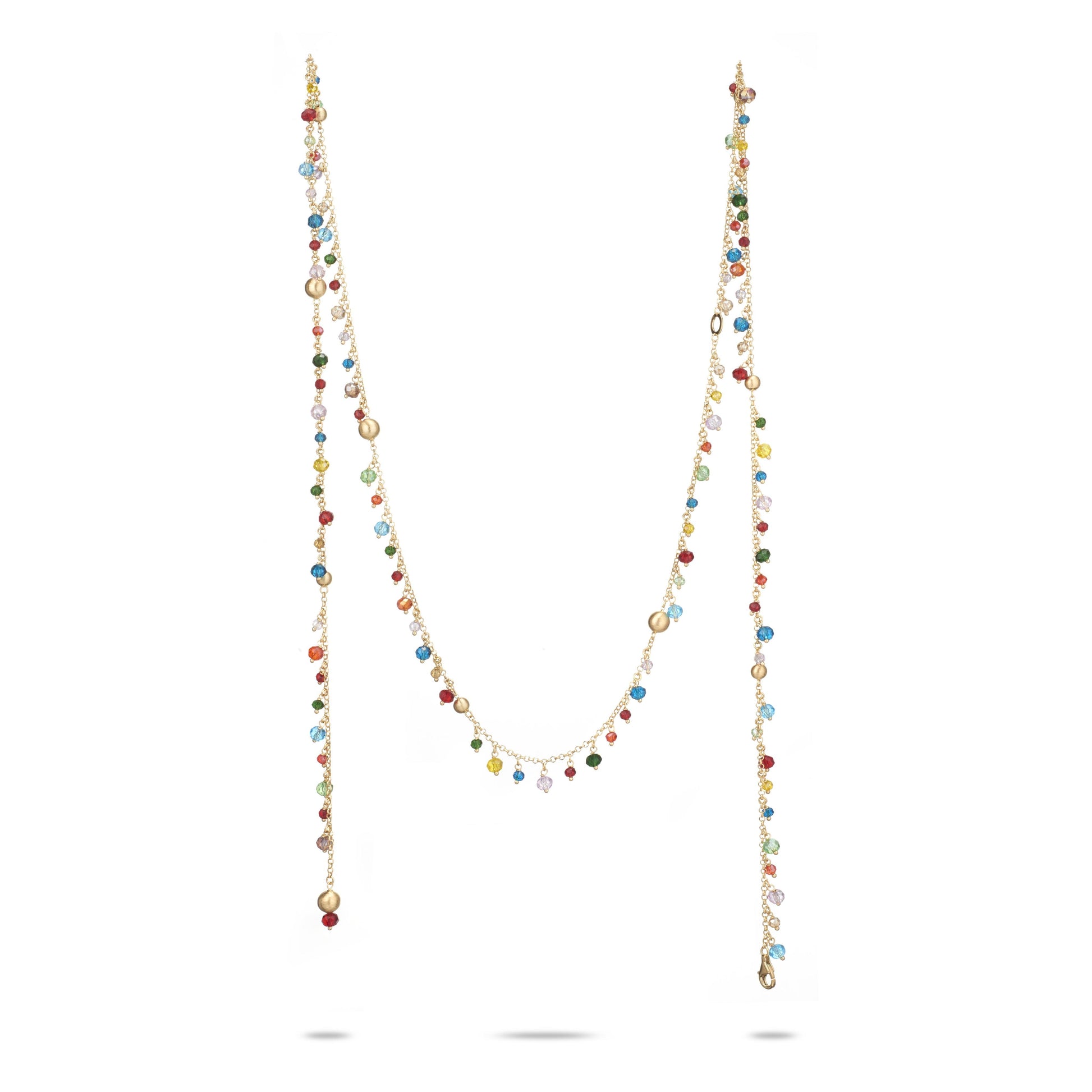 Colori, luce e movimento si fondono in questa collana lunga, realizzata in Argento 925 con pregiata Laminatura in Oro 24KT e impreziosita da cristalli naturali multicolor disposti su tutta la lunghezza. Ogni pietra riflette l’energia del sole e dona un tocco di eleganza solare al tuo look.