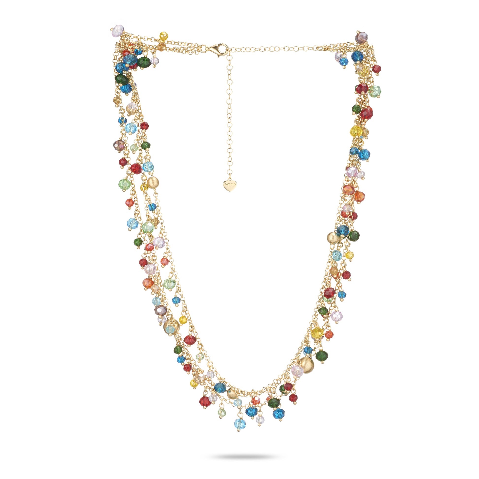 Scenografica, luminosa e vibrante: la Collana Statement Formentera è il gioiello protagonista dell’estate. Realizzata in Argento 925 con laminatura in Oro 24KT, è arricchita da una fitta sequenza di cristalli naturali multicolor che donano luce e movimento a ogni gesto.