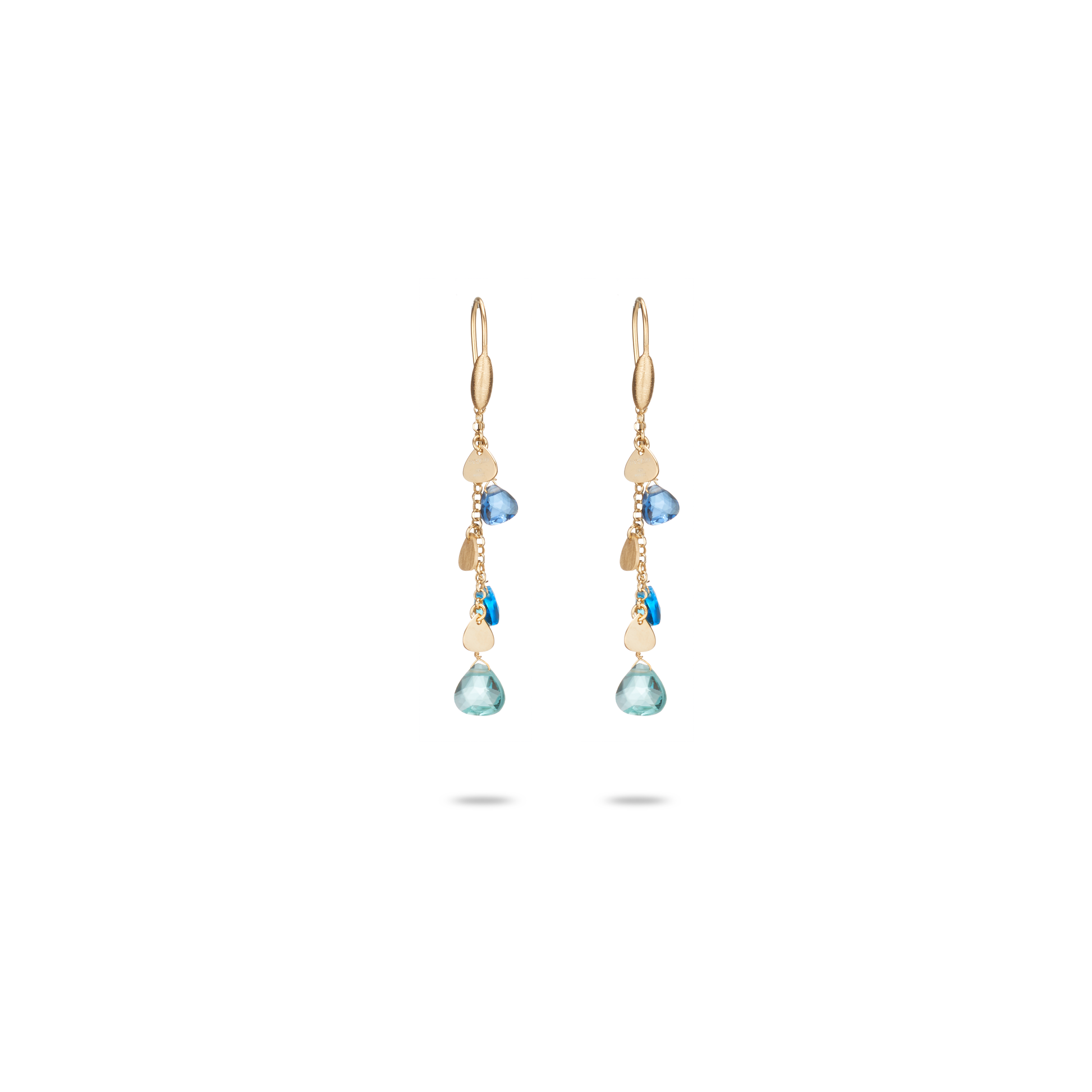 Realizzati in Argento 925 con laminatura in Oro Puro 24KT, sono impreziositi da cristalli naturali topazio e acquamarina a goccia, taglio diamante, che riflettono brillantezza e freschezza.
