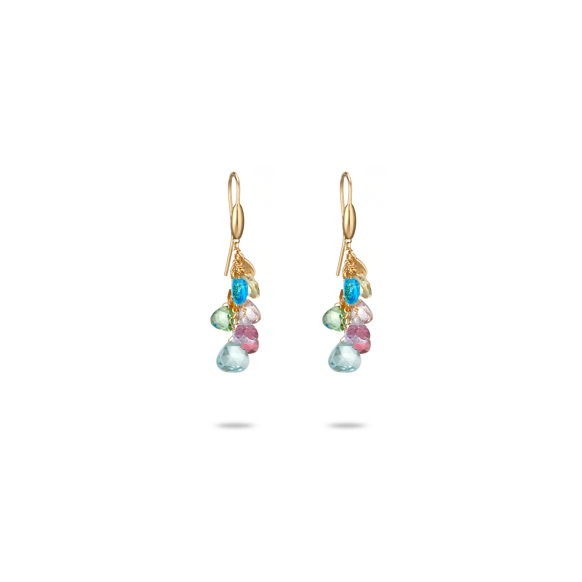 Realizzati in Argento 925 con laminatura in Oro Puro 24KT, sono arricchiti da cristalli naturali multicolor taglio diamante a goccia, che riflettono la luce con brillantezza e movimento.