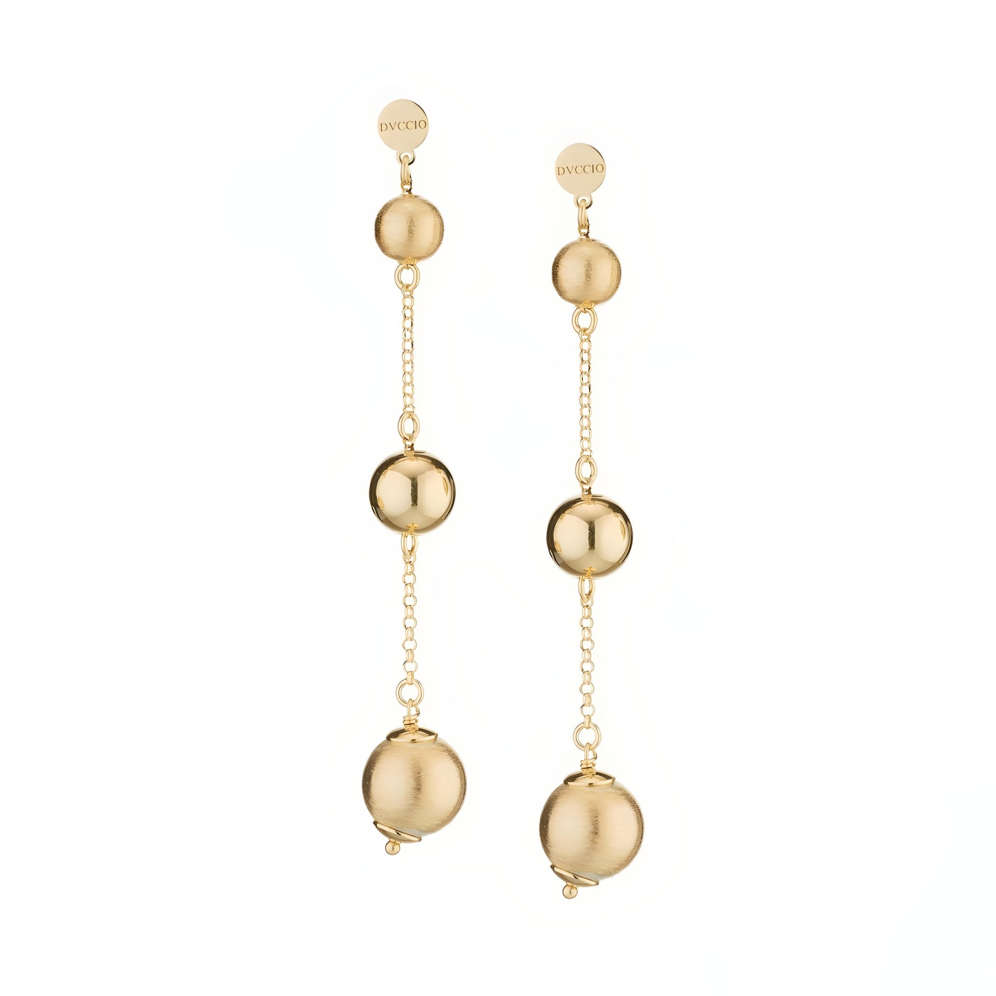 Eleganti e luminosi, questi orecchini in argento 925 con laminatura in oro 24KT presentano una fine catena rolò da cui scende una cascata di sfere tonde lavorate a mano, setate e lucide, che creano un gioco di luce raffinato. L’alternanza di texture e la cura artigianale del dettaglio li rendono ideali per aggiungere un tocco di eleganza a ogni outfit, dal giorno alla sera.